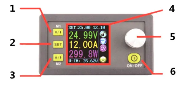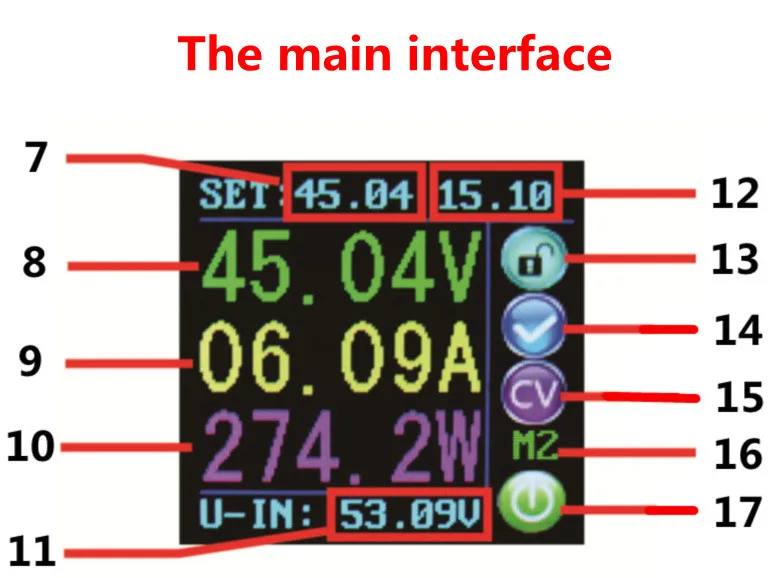 При подключении источника питания экран сначала показывает окно приветствия, а затем переходит в основной интерфейс. На главном интерфейсе выходной набор значений напряжения и выходной набор значений тока находится в верхней части экрана. Большое значение шрифта слева-это настоящее выходное напряжение тока, настоящий выходной ток и реальная выходная мощность тока. Входное напряжение находится в нижней части экрана. Справа от экрана есть некоторые значки бегущего состояния, значок блокировки ключа, значок аномального выходного состояния, значок постоянного напряжения и постоянного тока, значок наконечника набора данных и значок вывода открытия или закрытия.
