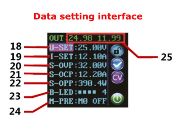На главном интерфейсе вы можете нажать кнопку SET, чтобы войти в интерфейс настройки данных. На интерфейсе настройки данных нажмите в ближайшее время V/& uarr; Или A/↓, чтобы перейти на страницу вверх или страницу вниз, чтобы U-SET или I-SET, затем установите выходное напряжение и выходной ток таким же образом, как и в главном интерфейсе.